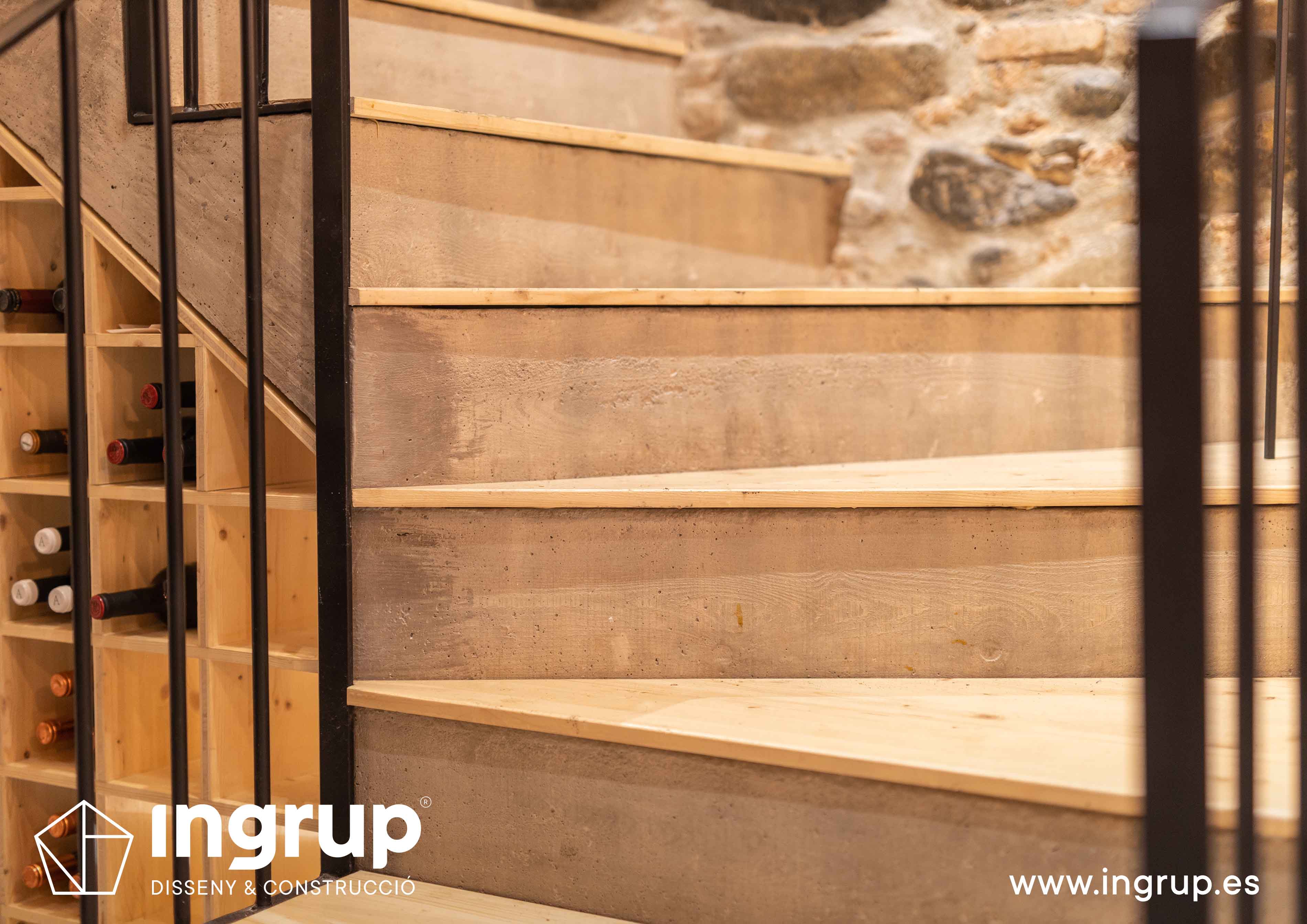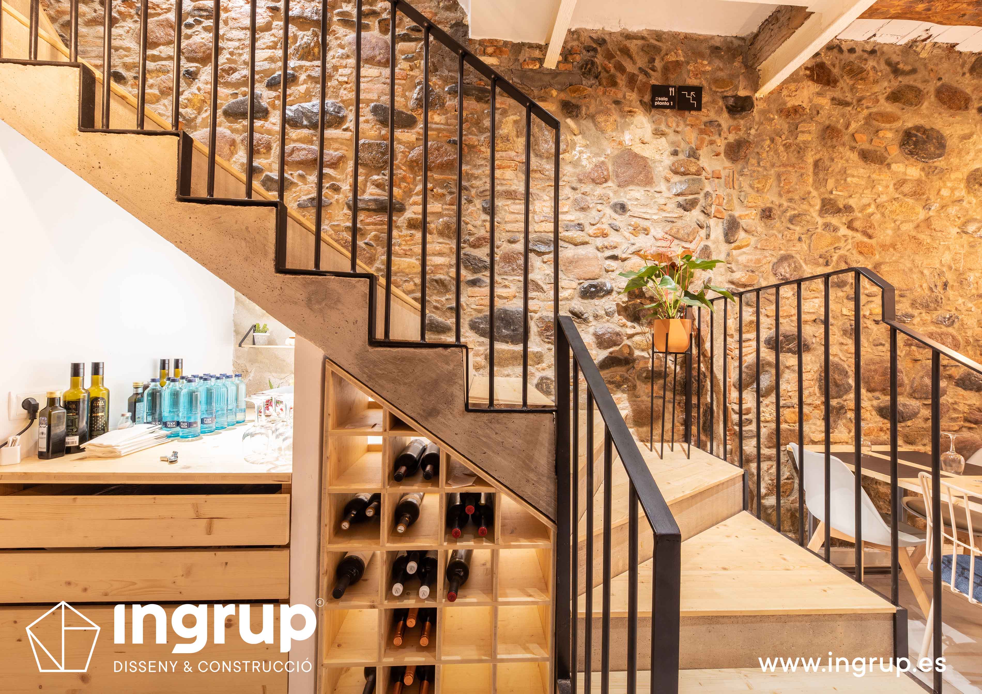 El interiorismo y la distribución, renderizados 3D, limpieza y saneamiento del local, repicado de paredes para dejar piedra vista y obra vista, diseño y construcción de nueva estructura de escalera de hormigón y barandilla a medida, techo continuo de pladur, trasdosados y tabiques, nueva instalación de electricidad y agua, colocación de pavimento cerámico, fabricación de mobiliario a medida, proyecto de iluminación, pintura, vinilos decorativos y rotulación del local.