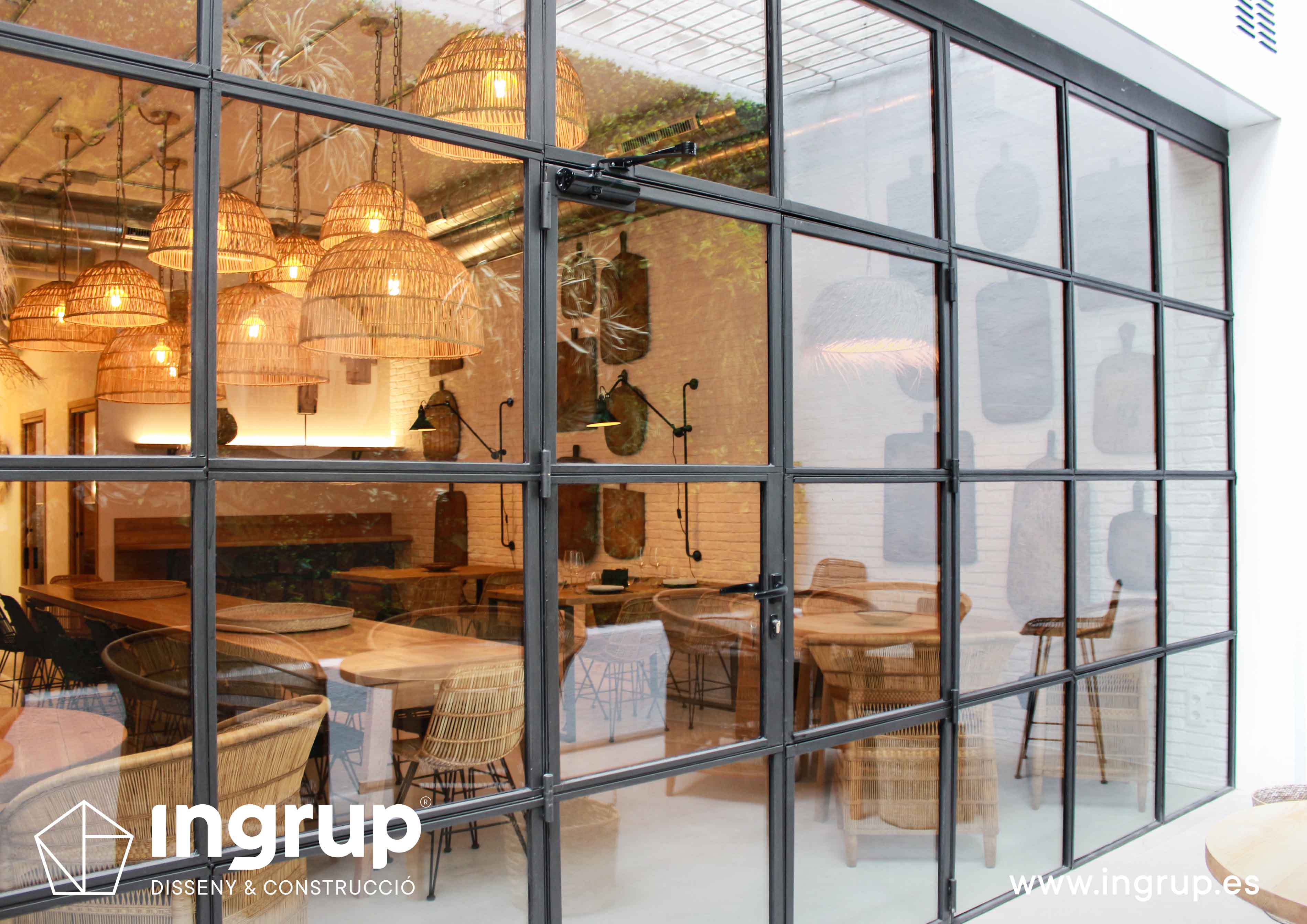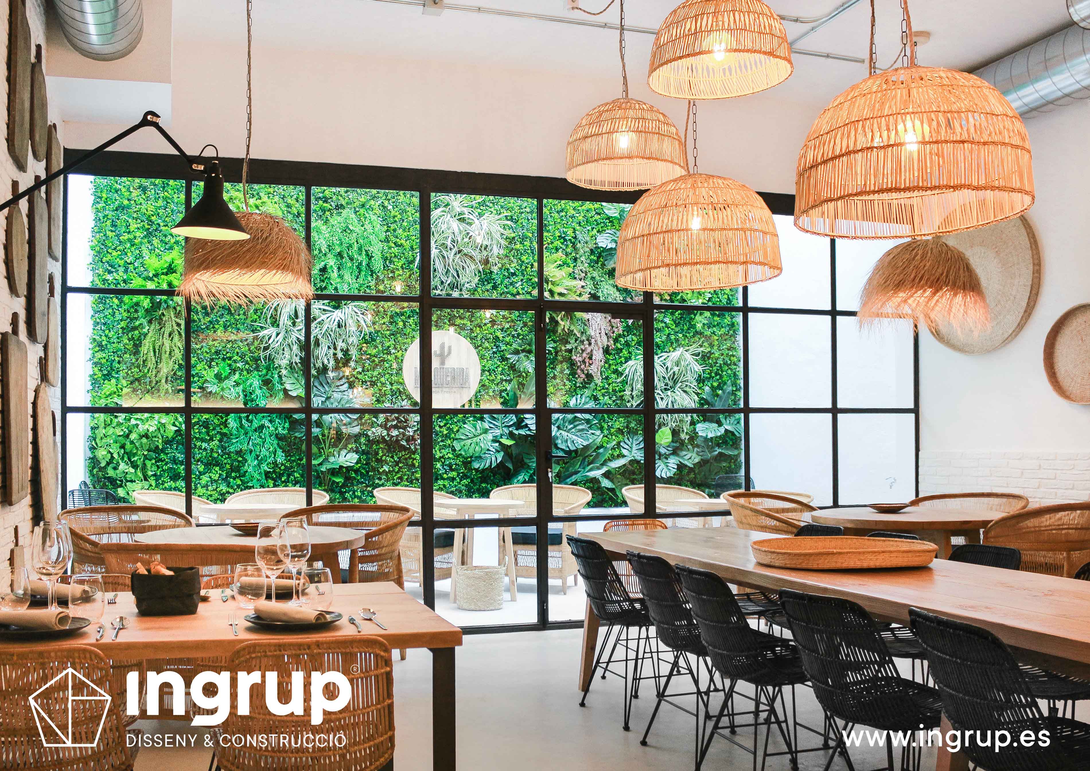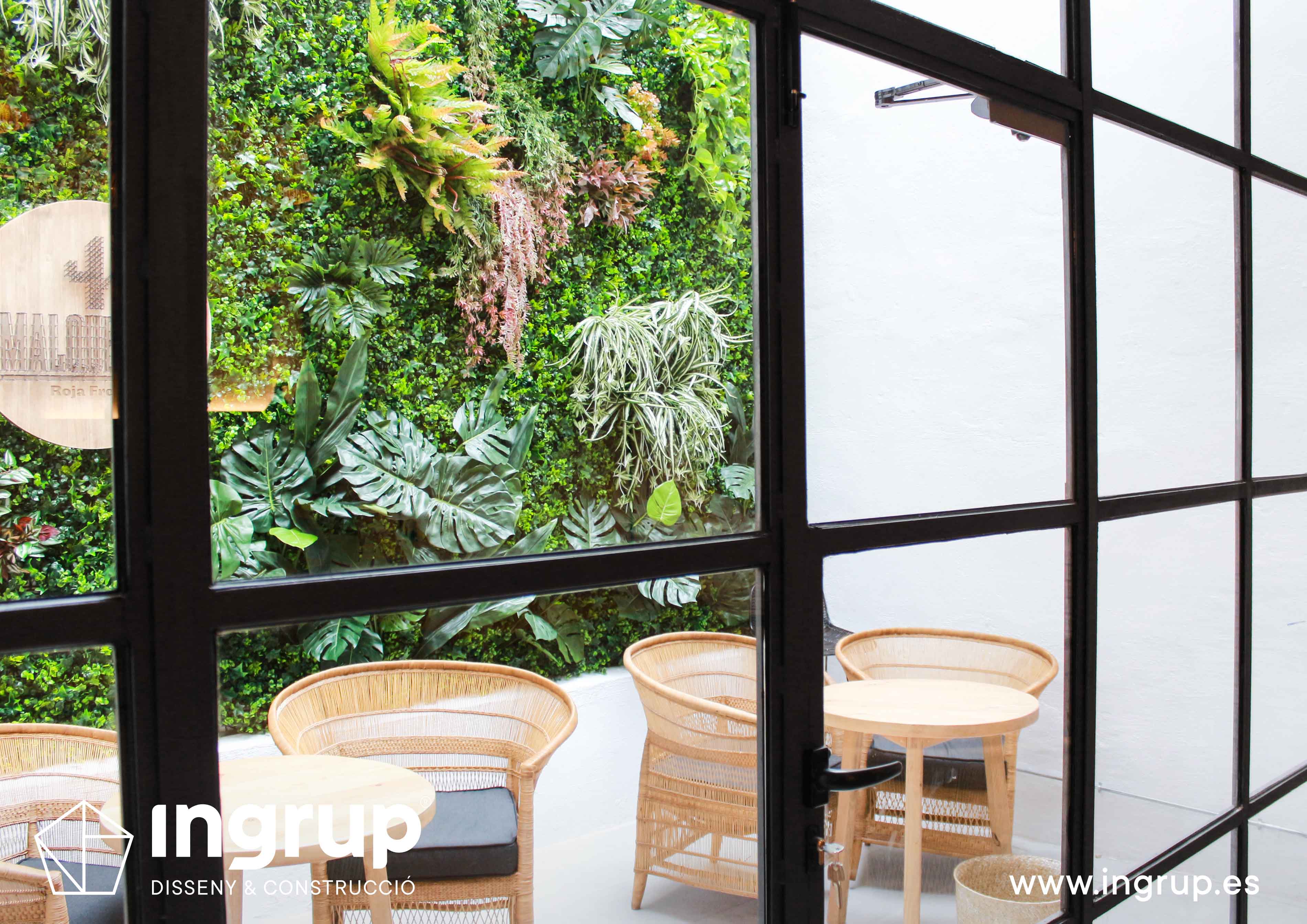 Derribo de paredes y colocación de vigas estructurales, construcción de barra de pladur y trasdosados. Proyecto de iluminación, fabricación a medida de cristalera de gran formato para terraza interior y colocación de jardín vertical. Pintura decorativa y rotulación exterior.