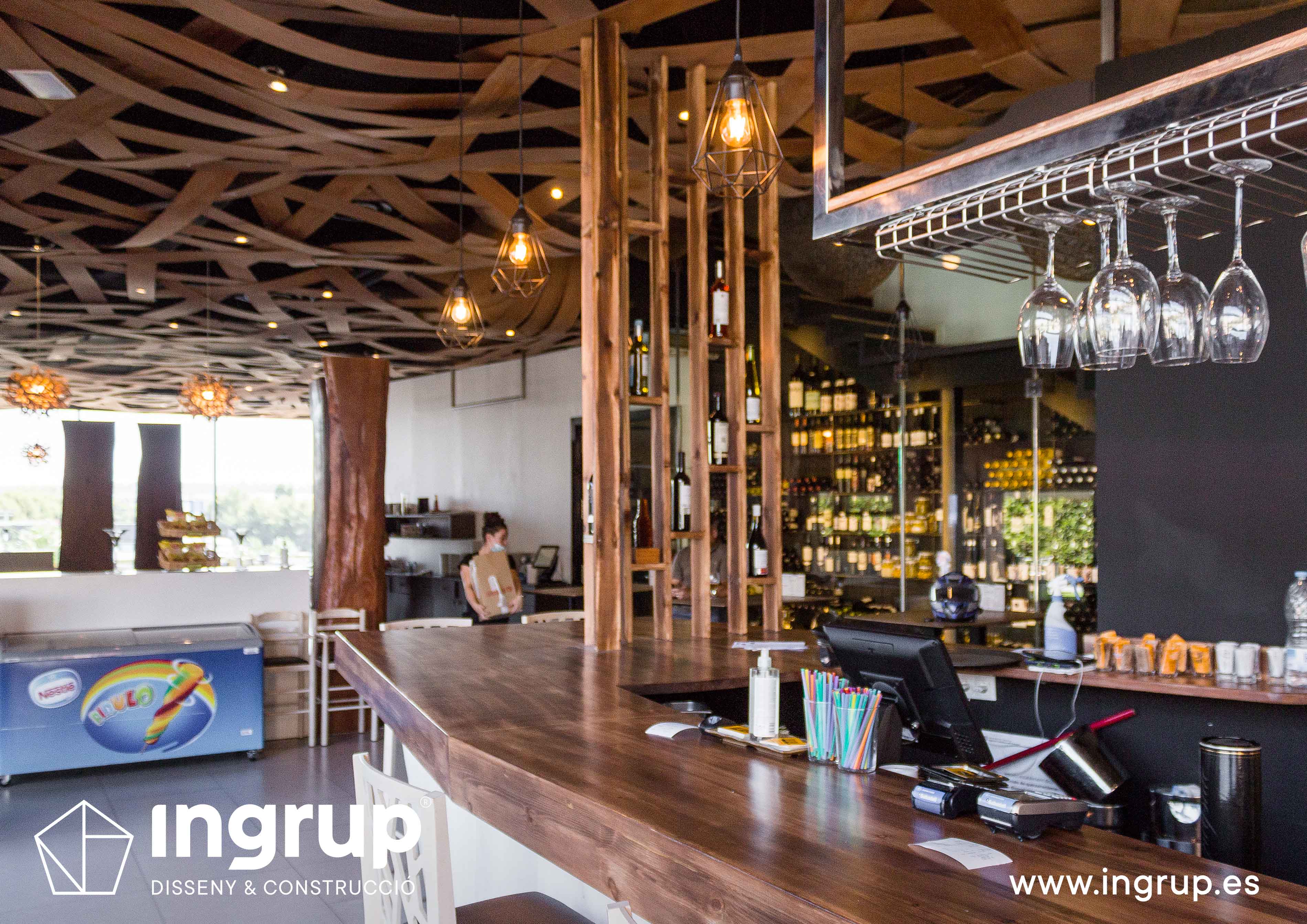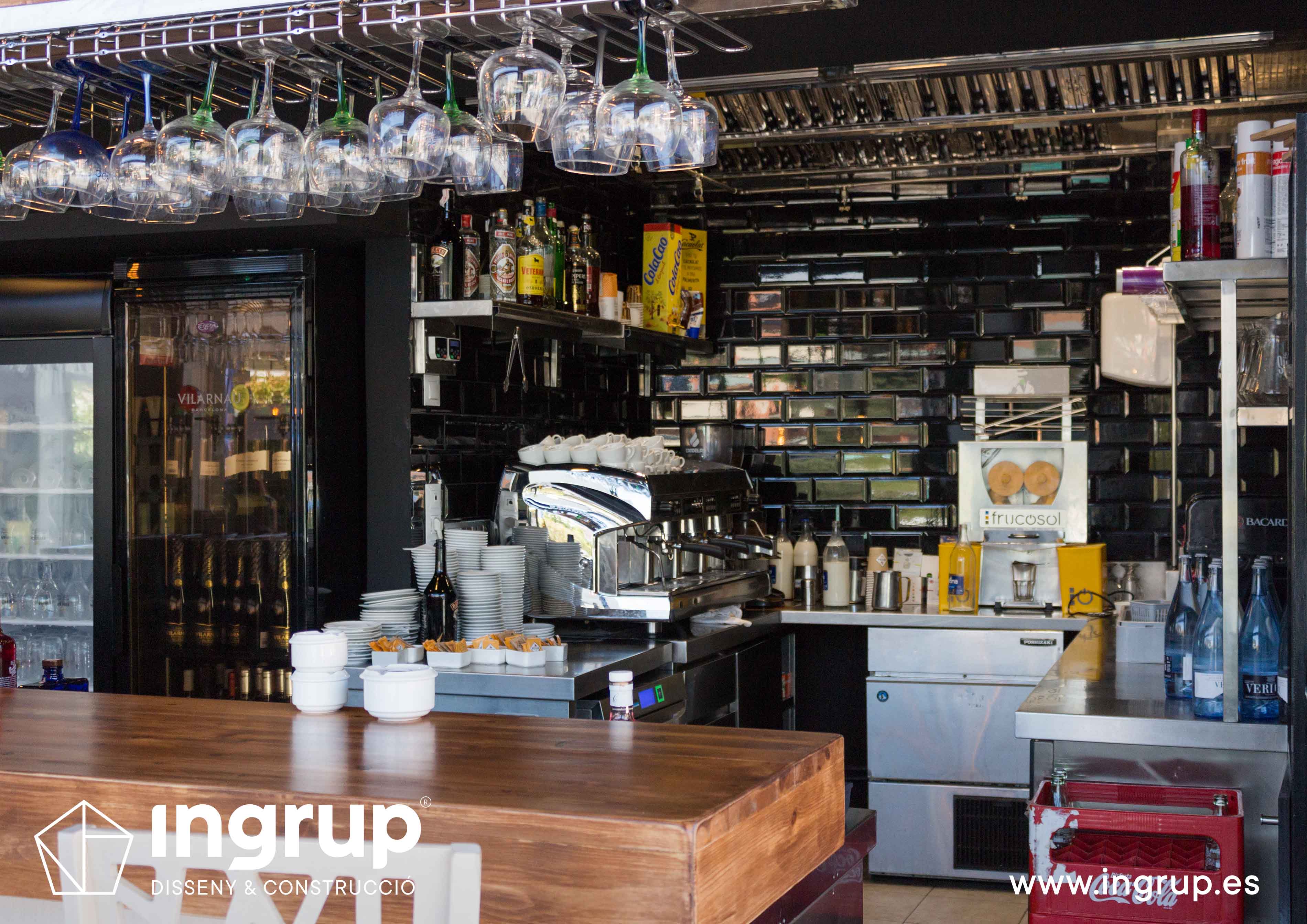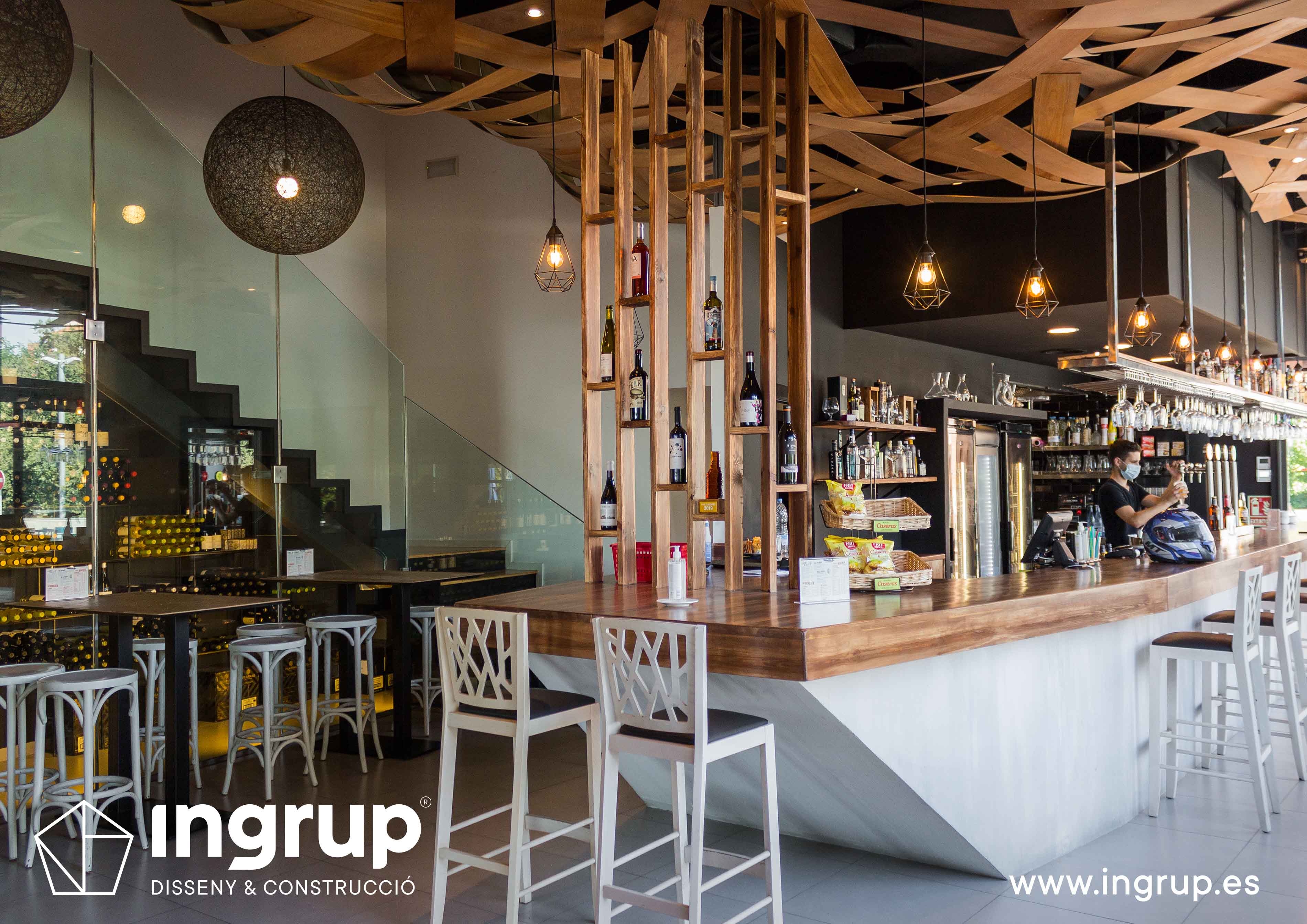Proyecto de interiorismo con nueva distribución. Diseño de nueva barra de bar, nuevo diseño de falso techo. Realización de nuevos desagües, colocación de pavimento, alicatado, pintura decorativa, proyecto de iluminación.