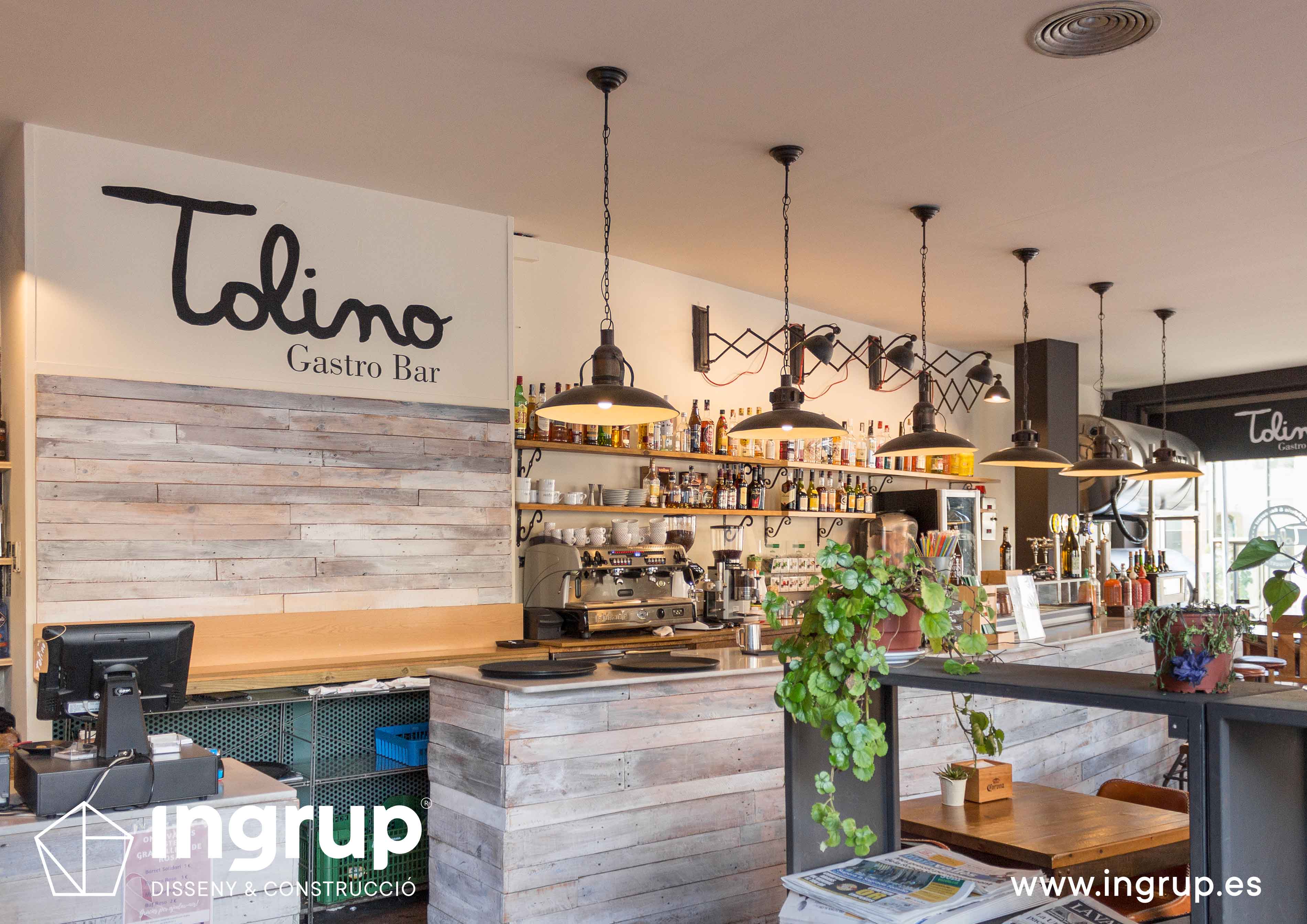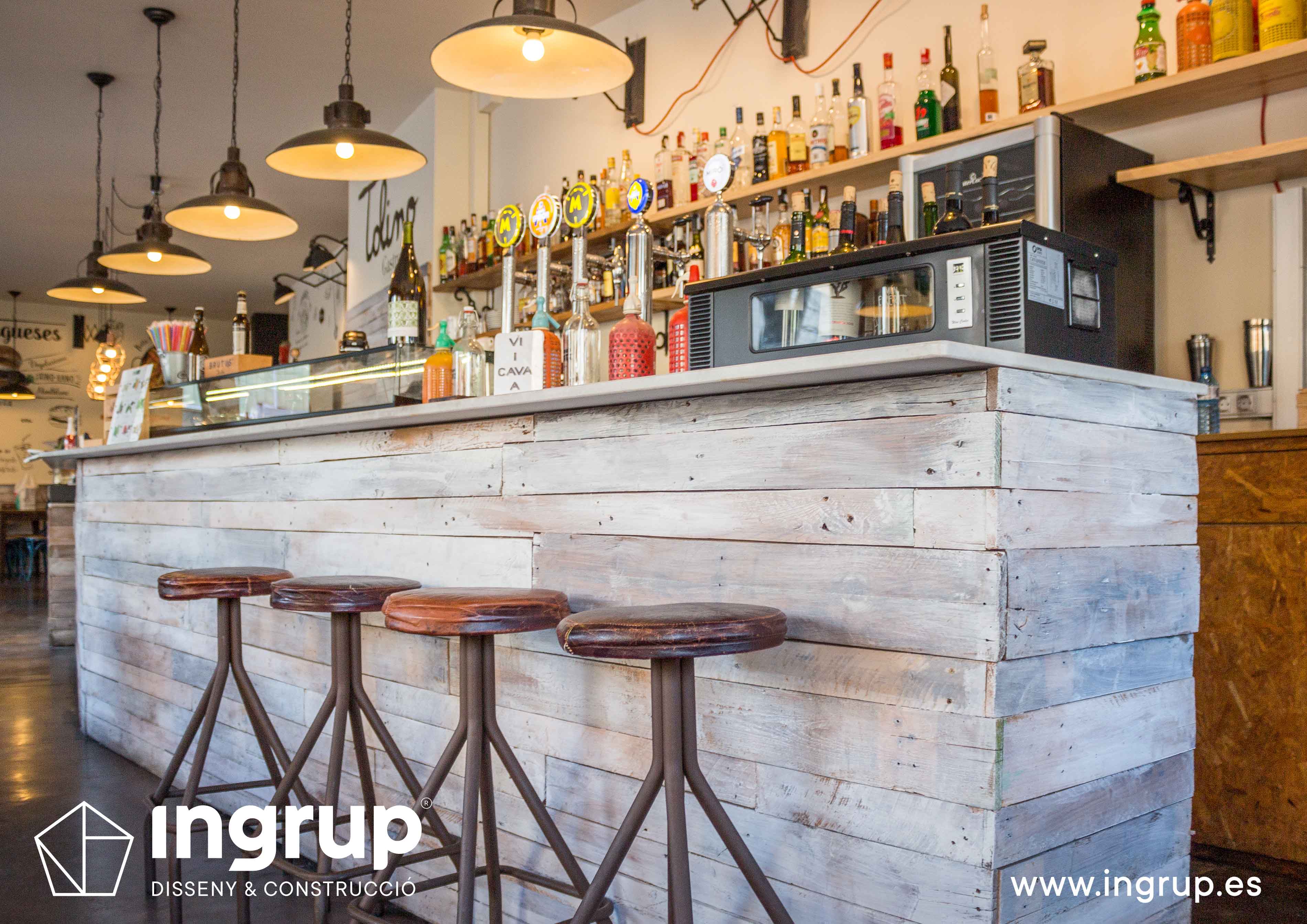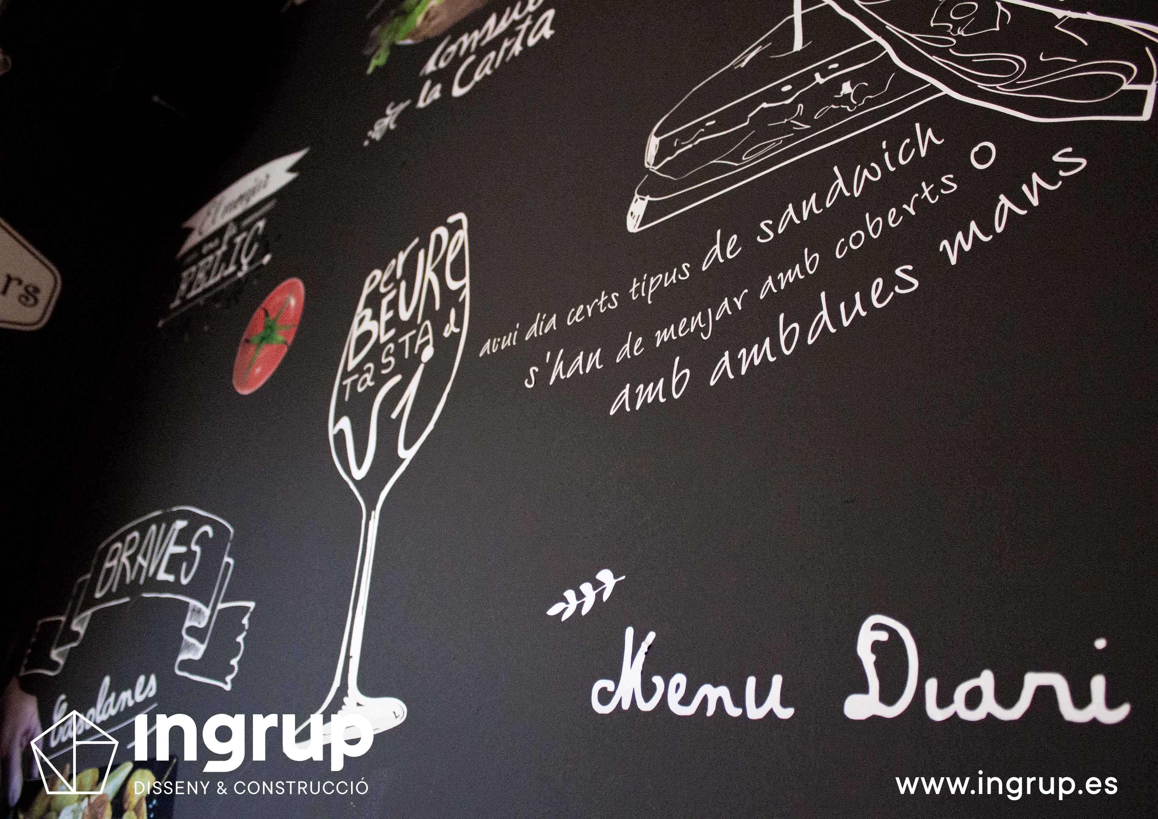 proyecto de interiorismo y decoración del local. Revestimiento de barra en madera envejecida, pintura integral y proyecto de iluminación. Diseño y aplicación de imagen corporativa, rotulación exterior e interior, letras corpóreas y vinilos decorativos.